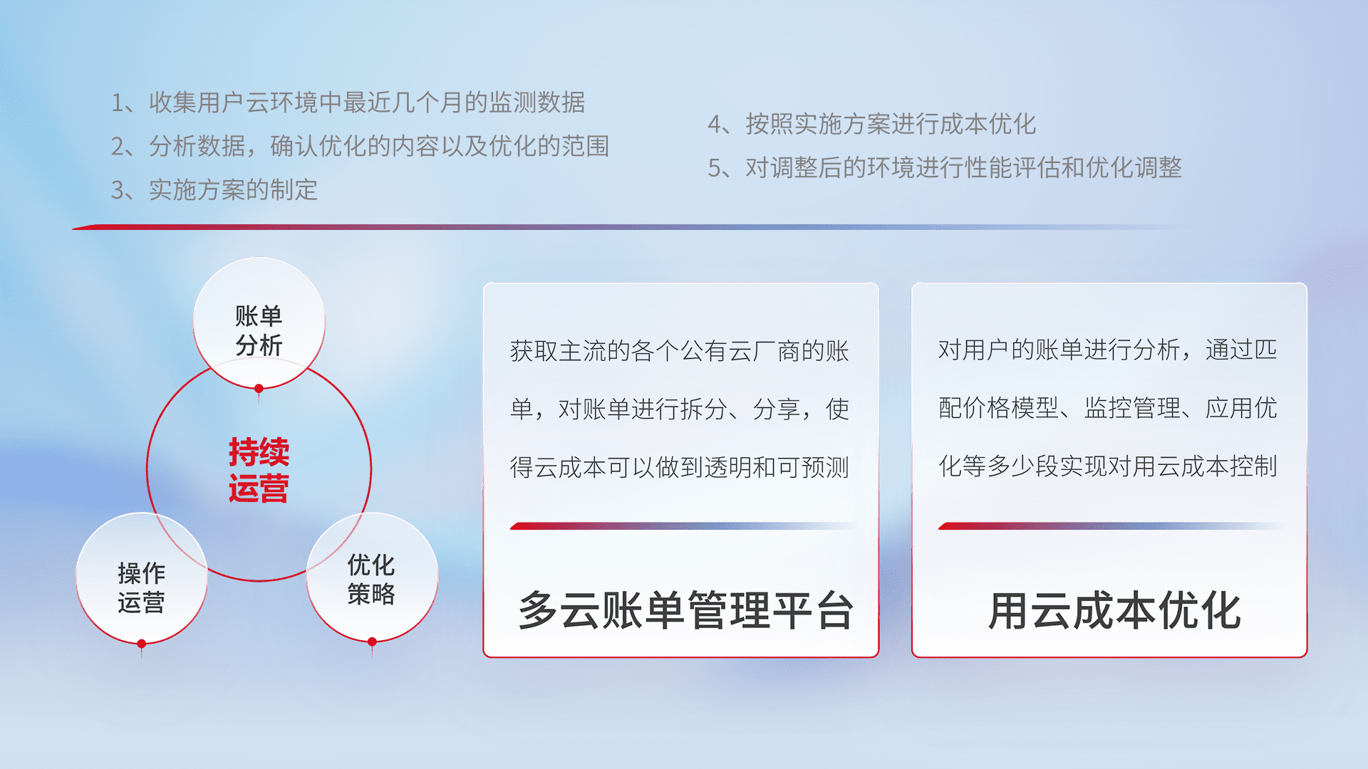 通过多云纳管,,,,以统一的资源数据模型把客户的云资源进行抽象和封装,,进而实现对多云资源的统一操作,,保障云资源管理的可靠性、、、稳定性与可用性。。。。量身定制化运维内容,,配置、、、开发运维、、补丁管理、、备份、、、、监控、、认证和访问管理、、审计和日常巡检等,,,保障在用云过程中的可靠度,,稳定度以及高可用率。。。