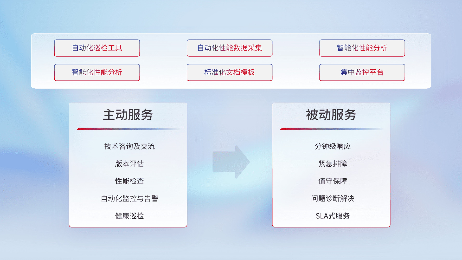 智能化工具和标准化文档,,,,保障服务质量,,,提供主动服务(包含技术咨询、、版本评估、、、性能检查、、自动化监控与告警、、、健康巡检)和被动服务包含(分钟级响应、、紧急排障、、、、值守保障、、、问题诊断解决、、SLA服务)。。。。